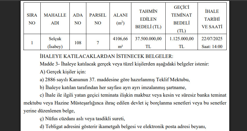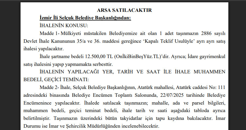 SELÇUK BELEDİYESİ'NDEN YENİ ARSA SATIŞI: 37 MİLYON 500 BİN TL. SAT SAT NEREYE KADAR?